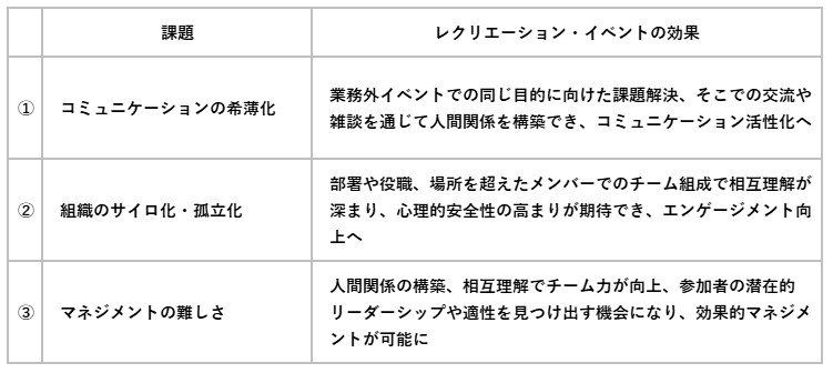 この課題を解決する糸口になるのが、社内運動会などのレクリエーション・イベント。これらは、組織のサイロ化や心理的安全性の低下といった課題に対する処方箋になり得るばかりか、チームビルディング効果も期待できるコスパの高い戦略的な投資になる可能性があります。
