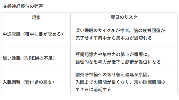 睡眠時間を量で追わず、質で生産性を担保する攻めの睡眠戦略が必要。交感神経の暴走を意図的に止め、「質」を高めてリカバリー効率を最大化することが重要です。