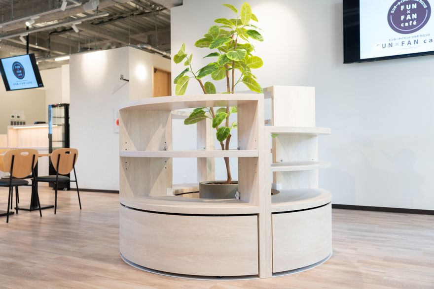 定期的に変わるコラボキャラクターに対応できるよう、デザインテーマは「Natural & Neutral」に設定。どのようなコンテンツにも馴染む内装テイストを目指しました。シンプルな空間ながら、素材感のある内装材で遊び心をプラス。既存のスケルトン天井を活かすことで、カジュアルで親しみやすい雰囲気に仕上げています。