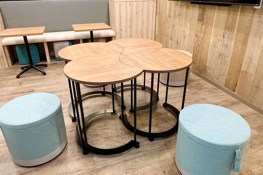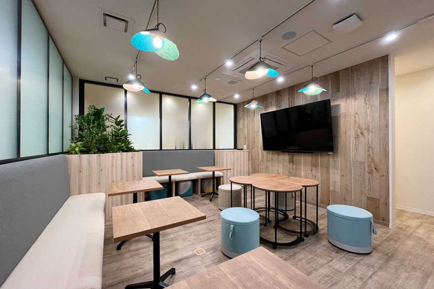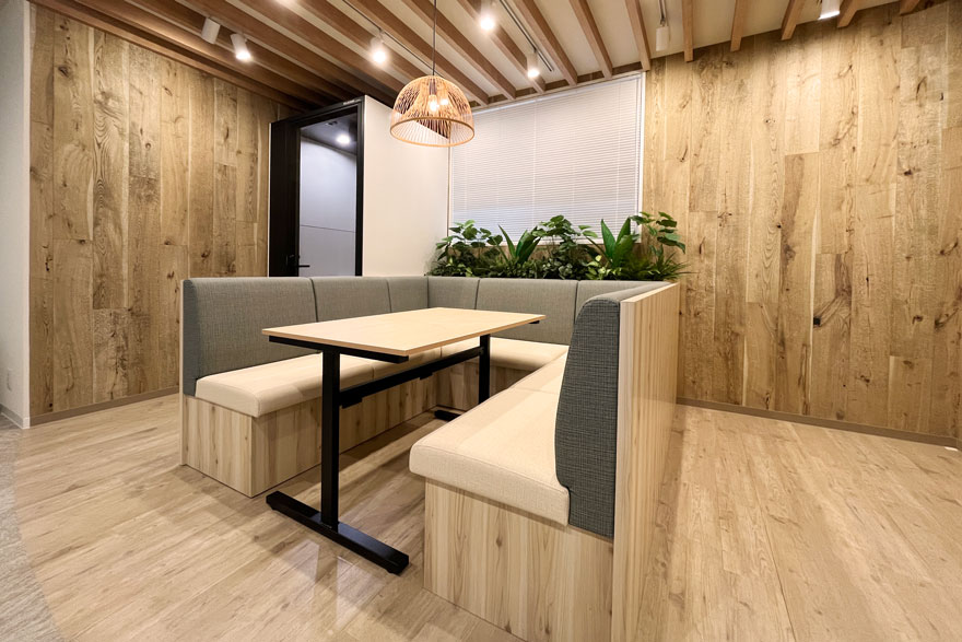 社員が自由に利用できる交流ラウンジを新設しました。家具は利用人数や用途に合わせて動かしやすい製品を選定。全体をカジュアルで温かみのある雰囲気に仕上げ、コミュニケーションを促す空間をめざしました。